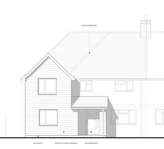 Planning permission granted for a two storey side extension and rear extension to a property within Sway defined village. Contemporary extension provides a home office, WC, utility space, additional bedroom and family bathroom. The extension is clad in horizontal timber, contrasting with the existing brickwork. The covered porch gives a welcoming entrance, combined with internal alterations to improve the flow of the ground floor.