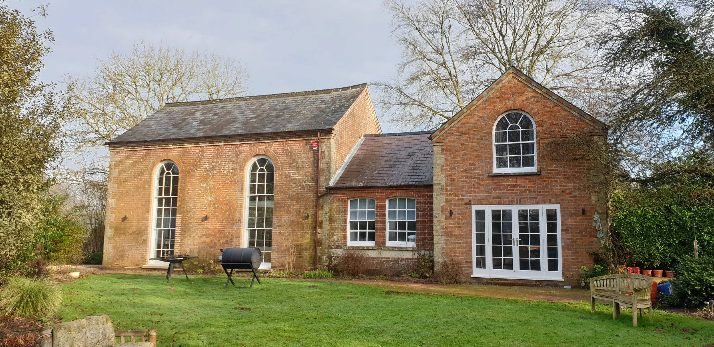 We are delighted to be able to share this detailed re-working of a converted nineteenth-century Wesleyan Chapel in Wiltshire. The main Chapel space has stunning new double-height sliding period sash windows to connect the Chapel space to the garden and flood the living space with light. The impractical spiral staircase has been removed and replaced by a new, floating timber staircase under a generous roof light above a galleried hallway. An enlarged new kitchen is fitted with modern furniture featuring mellow oak units under sophisticated solid surface worktops. Beautifully appointed bathrooms and bedrooms feature on the first floor and the landing leads to the large chapel gallery that overlooks the main space. A small section of glass floor lies adjacent to one of the new full-height windows. Underfloor heating combines with ornate, refurbished cast iron radiators and the house is fitted with up-to-the-minute smart home technology.